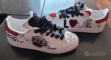 Adidas originali custom con dettagli glitter e scritte a mano in stile street-art. Non passano inosservate, indossate pochissimo, perfette per chi ama distinguersi con un look giovane e super trendy.