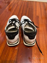 Sneacker Philippe Model da donna, bianche con lacci meri glitterati e retro glitterato. Usate pochissimo per cambio numero. Adatte anche per ragazza, molto fashion e alla moda. Suola perfetta. Vestibilità normale.