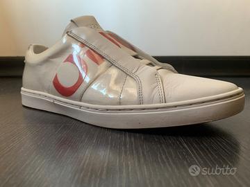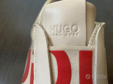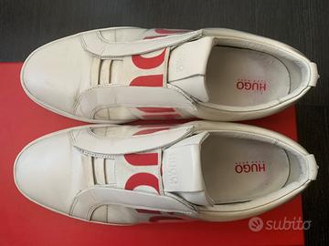 Vendo sneackers Hugo Boss in pelle taglia 41 usate pochissimo, originali, colore bianco co e rosso, slip on no lacci. (su Amazon a 195 eur)