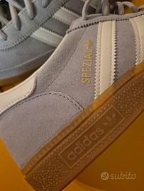 Sneaker Adidas Handball Spezial uomo, stile casual, grigio chiaro-azzurro polvere in pelle scamosciata US 10 - UK 9 1/2. Tomaia in suede premium e suola in gomma 2,5 cm. Con logo dorato metallizzato sul lato. Nuove mai utilizzate, senza scatola.