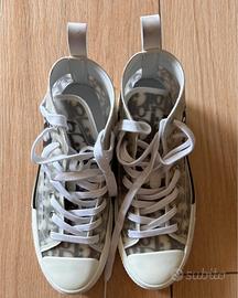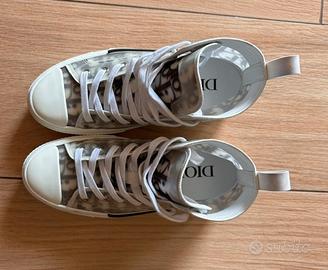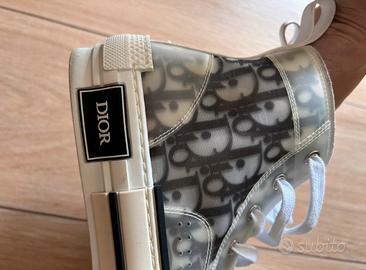Questa sneaker alta B23 League si distingue per la sovrapposizione di inserti trasparenti e tela Dior Oblique bianca e nera. Dettagli essenziali come gli occhielli e la chiusura con lacci frontale, la suola in gomma bianca, il puntale arrotondato e rinforzato, e il tirante posteriore richiamano il design della classica sneaker alta. Gli elementi laterali a contrasto, inclusa la firma Dior, completano questa calzatura ideale da abbinare a qualsiasi outfit casual.