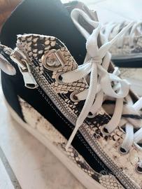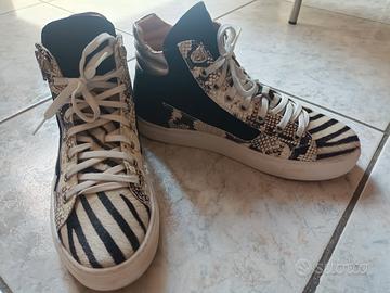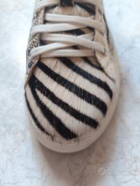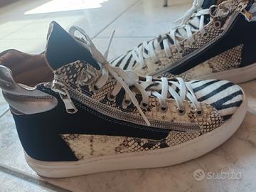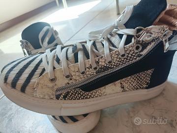 Interno in pelle naturale, suola in gomma flessibile e pelle, estraibile.