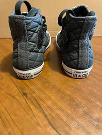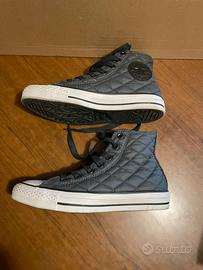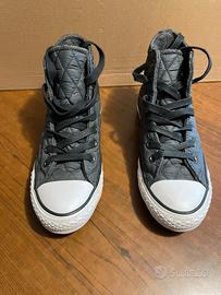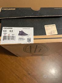 Questa scatola contiene un paio di sneaker Converse Chuck Taylor All Star High nel colore "Storm Wind". ", un grigio fumo con una sfumatura bluastra. Il modello specifico identificato dal codice prodotto 149451C visibile sull'etichetta è una scarpa unisex caratterizzata da una tomaia in tela resistente, i classici lacci e la punta in gomma bianca. Dettagli del Prodotto Modello: Chuck Taylor All Star High. Codice Prodotto: 149451C (indicato sull'etichetta). Colore: Storm Wind (Storm Wind/B). Taglia: 4.5 Uomo / 6.5 Donna (corrispondenti a una taglia 37 EUR o 23.5 cm)