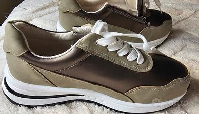 Sneakers da donna nuove, mai usate, numero 37. Modello fashion–comfort con tomaia bianca, inserti in suede e zip laterale per indossarle facilmente. Suola alta e ammortizzata, molto comoda per camminare. Colore elegante bronzo/grigio, lacci bianchi, interno morbido. Condizioni perfette, nessun difetto o segno di usura. Consegna a mano a Rozzano o spedizione.
