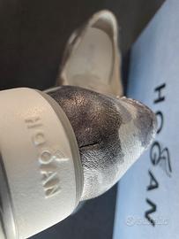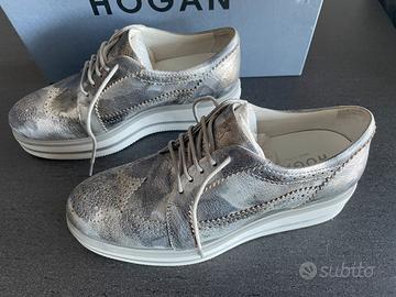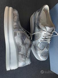 Sneaker HOGAN donna n.37 N. Route Zeppa Derby sfumature grigie effetto metallizzato. Realizzate in pellame altamente selezionato con tamponatura a mano per creare sfumature chiaro scuro. In confezione originale. Prezzo di listino come da foto € 340,00. In vendita ad € 115,00.