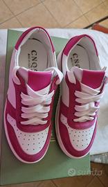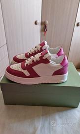 Sneaker in vera pelle bianca con inserti scamosciati fucsia.