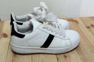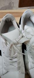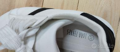 Vendo bellissime sneaker "LORA FERRIS" originali numero 37. Le scarpe presentano un design minimalista ed elegante in similpelle bianca con l'iconica banda laterale e il talloncino neri a contrasto col bianco. Stile Stan Smith (casual/sportivo). Lacci bianchi e larghi anch'essi in ottime condizioni, suola in gomma color miele scuro. Usate pochissimo come si può vedere dalle foto la a struttura è integra e la suola non è consumata dall'usura.