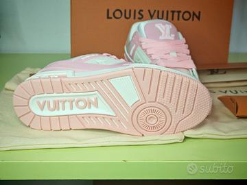 sneaker Louis Vuitton LV Trainer da donna, originariamente disegnata da Virgil Abloh e reinterpretata in una versione femminile con una combinazione di colori pastello.
