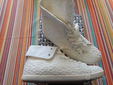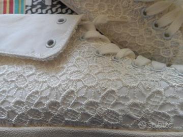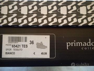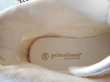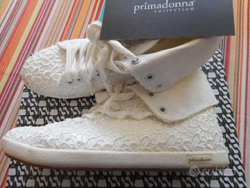 Sneaker bianca da donna o ragazza, misura 36, caratterizzata da un elegante motivo in pizzo floreale che ricopre l'intera parte superiore. Presenta lacci bianchi con occhielli in metallo, che aggiungono un tocco raffinato e moderno. La scarpa fa parte della Prim Collection di Primadonna.