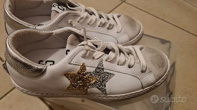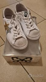 Sneaker in pelle bianca con dettagli in glitter oro e argento. Taglia 38. Indossate una sola volta. Scatola originale.