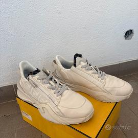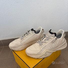 Sneakers scarpe di ginnastica Fendi Flow da uomo di colore avorio ecrù realizzate in pelle di vitello liscia con inserti in jacquard ricamato a motivo FF caratterizzate da logo stampato sul lato e logo in rilievo sulla linguetta, zip laterale regolabile e chiusura con lacci Caviglia imbottita e tirante logato sul tallone. Logo stampato all’interno. Suola sagomata. Numero 45 italiano / europeo Condizioni: usate, condizioni come da foto ma ben tenute . Non più muniti di scatola !!!!