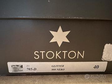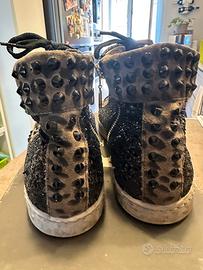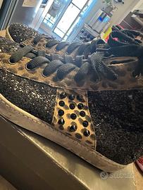 Scarpe sneaker Stokton con glitter neri, borchie e stampa animalier. La suola effetto “usata” è tipica del modello. Usate una sola volta, nuovissime.