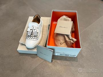 Scarpe artigianali Santoni nuove, numero 37.5, dotate di tutto il corredo originale come si vede dalle foto. Mocassino Santoni in pelle total white. I dettagli la fanno da padrona; come i decori forati sulla tomaia o la maxi frangia e le nappine impreziosite da applicazioni metalliche. La suola a cassetta in gomma bianca disegna un profilo compatto e pulito. Prezzo retail EUR 390. Preferibile il ritiro a mano ma disponibile la spedizione a spese dell'acquirente.