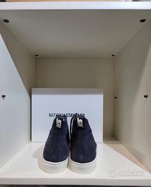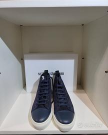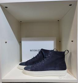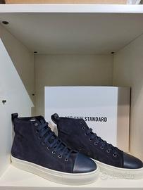 Sneaker alta con tomaia in suede di colore blu. Puntale anteriore con lunetta in pelle di colore blu,lacci doppi in cotone riciclato,etichetta di tessuto con logo applicato sia sulla linguetta del collo piede che sul contrafforte posteriore. Saletta interna ergonomica in soffice lattice alta 2,5cm per una calzata leggera e confortevole. Battistrada in gomma super light con fondo antiscivolo di colore bianco. Articolo nuovissimo di boutique taglia 42