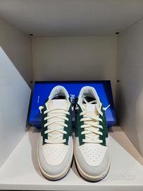 Sneaker uomo con tomaia in pelle vegetale di colore avorio. Puntale anteriore con piccoli fori solosul primo strato di pelle,bordi in suede di colore grigio perla,suede scamosciata su i due lati fino al contrafforte posteriore di colore verde bottiglia. Lingua centrale in tessuto di nylon imbottita di colore beige e lacci doppi in cotone vegetale. Lunetta posteriore in pelle di colore beige con logo P448 di colore grigio. Soletta interna ergonomica in soffice lattice alta 2,5cm per una calzata leggera e confortevole. Battistrada in gomma super light bicolore,con fondo antiscivolo. Taglia 43