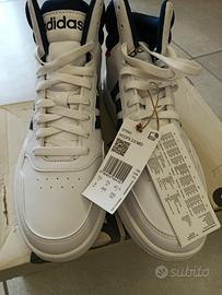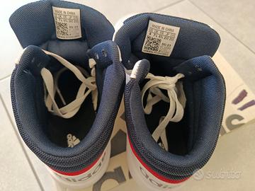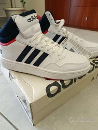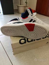 Sneakers Adidas alte, colore bianco con inserti blu e rosso. Originali con cartellino, mai indossate.... nuovissime!
