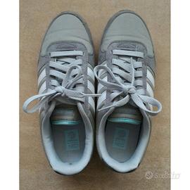 Sneakers in camoscio e tela grigia con fasce bianche e profili verde acqua modello Adidas Neo. Taglia 36 2/3 e vestono sino a 37. Indossate un paio di volte. Pari al nuovo.