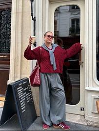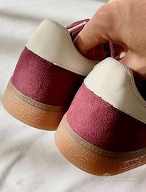 Tomaia in velluto a coste bordeaux con motivo a tre strisce bianche, tomaia in pelle scamosciata, stile retrò ed elegante, leggere. Progettate per i giocatori di pallamano nel 1979, queste scarpe sono pensate per un look elegante e raffinato.