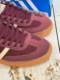 Tomaia in velluto a coste bordeaux con motivo a tre strisce bianche, tomaia in pelle scamosciata, stile retrò ed elegante, leggere. Progettate per i giocatori di pallamano nel 1979, queste scarpe puntano a un look elegante.