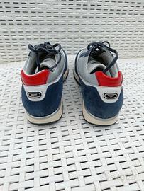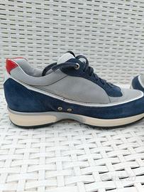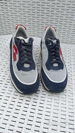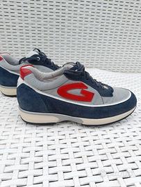 Sneakers di lusso Alberto Guardiani, modello Gleen. Taglia 39. Colore blu navy, grigio e dettagli rossi. Materiali: pregiato suede (scamosciato) e tessuto tecnico. Condizioni eccellenti, indossate pochissimo. Complete di scatola originale e sachetto. Made in Italy.