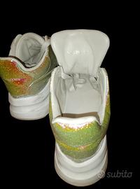 modello Oversized, Realizzate in pelle bianca con inserti glitter multicolor e dettagli iridescenti, offrono uno stile distintivo e moderno. La suola chunky in gomma presenta alcuni segni laterali da sfregamento, visibili in foto, già considerati nel prezzo proposto.