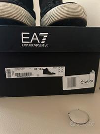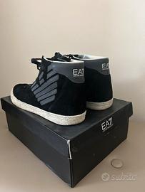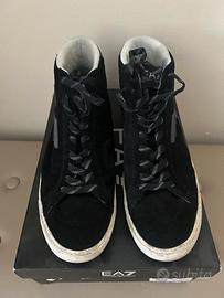 Scarpe da ginnastica alte in camoscio nero, con logo EA7 laterale in rilievo. Stile casual-sportivo, perfette per un look urban elegante.