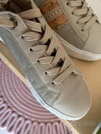 Vendo Sneakers Alviero Martini 1a Classe, usate pochissimo. Color champagne con brillantini e dettagli geografici tipici del marchio. Sono in ottime condizioni, gli unici difetti presenti sono nella linguetta dove “sbatte” l’occhiello dei lacci, e a livello di uno dei buchi dei lacci (vedi foto). Perfette per la primavera Taglia 37