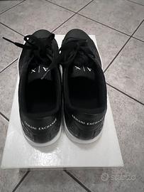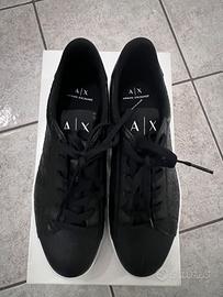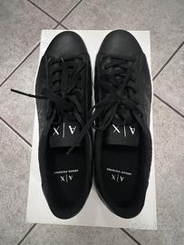 Vendo bellissime sneakers originali Armani Exchange (A|X) color nero, modello low-top dal design elegante e minimale. • Condizioni: 10/10 - Nuove, mai indossate. • Caratteristiche: Tomaia con lavorazione testurizzata (effetto Saffiano), logo A|X in contrasto sulla linguetta e logo impresso lateralmente. Suola in gomma bianca a contrasto. • Stile: Perfette sia per un look casual che per un outfit più ricercato (smart casual). • Incluso: Scatola originale Armani Exchange.