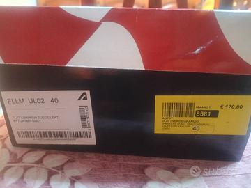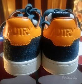 Splendide sneakers Autry (visibile sull'etichetta interna) in pelle scamosciata verde foresta. L'articolo è caratterizzato da dettagli a contrasto in arancione brillante, inclusi i lacci e il rivestimento interno. Numero 40. Nuove.