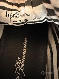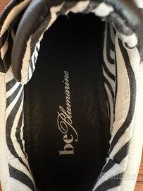Sneakers basse Be Blumarine, in pelle nere e bianche, glitterate, brand logo, punta tonda, suola in gomma.