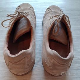 Sneakers uomo colore beige sabbia. In pelle scamosciata, con suola in gomma e sfiato per l'aria sul lato interno. Il numero non è segnato, ma calzano un 39 italiano.