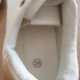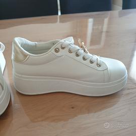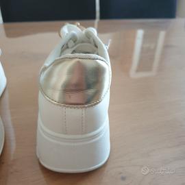 Tomaia in eco-pelle con finitura liscia e opaca con decorazioni sui lacci. Modello Platform con suola spessa 5 cm per aggiungere altezza mantenendo il comfort. Soletta interna estraibile soffice e traspirante. Le vendo perché purtroppo non corrispondono alla mia misura.
