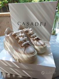 Sneakers nuove Casadei mai indossate per stile abbigliamento classico. Molto belle originali in tessuto lurex oro Fondo alto n 39