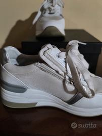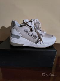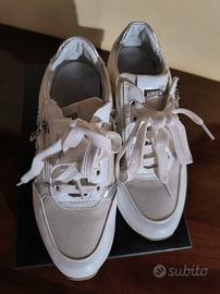 Sneakers Paciotti 4US bianche e argento con dettagli in strass. Tomaia in tessuto tecnico e pelle, logo laterale "4US" con strass. chiusura con lacci e zip laterale e suola platform.