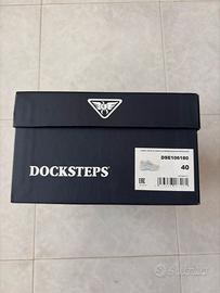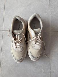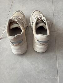 Scarpe da ginnastica da donna modello "chunky" (suola spessa e rialzata) del brand Docksteps. Modello "Chunky Low W 001". Colore bianco/panna con inserti in mesh traspirante e dettagli metallizzati color argento. Vengono vendute complete della loro scatola originale. Composizione indicata: Vegan Leather / Mesh / Leather. Condizioni: Le scarpe sono state usate poche volte. Strutturalmente sono però ancora integre e non ci sono buchi. Taglia: 40 (EU)
