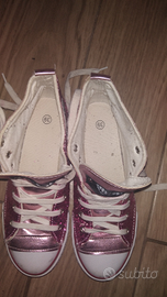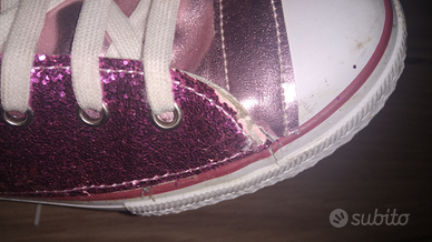 Sneakers converse 39 ( non sono originali, ma sono identiche) con glitter fuxia. Stupende, di grande effetto. Presentano dei taglietti come da foto. X il resto sono perfette e molto particolari. Indossate molto poco.