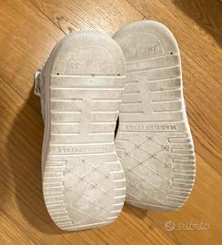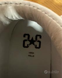 Scarpe Sneaker low da donna bianche numero 38 con tomaia in vera pelle, chiusura con lacci e suola in gomma antiscivolo. 2 stelle laterali. Usate pochissimo.