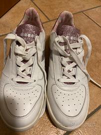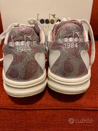 Vendo per inutilizzo scarpe sportive donna Diaora Heritage in pelle bianca e dettagli pelle in glitter brillantinata argento e rosa. Numero 38,5 (io ho il 38). Usate un paio di volte ma non presenta strisci o altro. Euro 30. Se spedite seguiranno accordi.