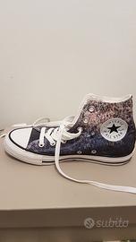 Sneakers donna CONVERSE ALL STAR "Originali" in tessuto modello alto. Multicolore sfondo blu (jeans). N. 37 Nuove mai indossate.
