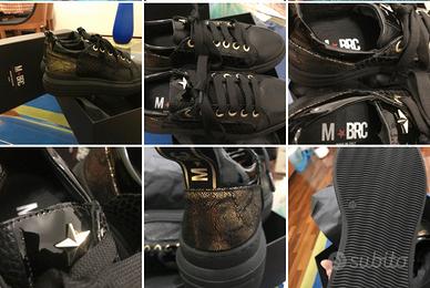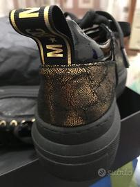 Eleganti sneakers da donna firmate Massimo Braccialini ( M BRC) in vera pelle, nere con stampa laterale pitonata nera, dettaglio oro sul tallone, fondo in gomma nera, lacci neri, soletta morbida in vera pelle estraibile. Made in Italy.