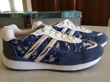 Sneakers donna n 38. Colore blu e bianco, con paillettes blu e argento. Tutto in ottime condizioni ad accezione dei lacci (che possono esser eventualmente sostituiti).