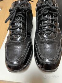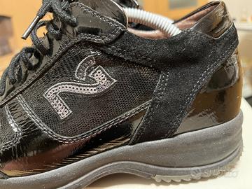 Vendo sneakers donna marchio NERO GIARDINI originali, in vernice nera, vera pelle n. 36, con logo in piccole paillettes nere, con inserti in pelle scamosciata nera.