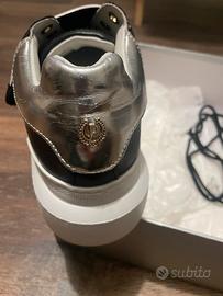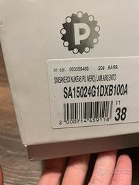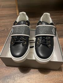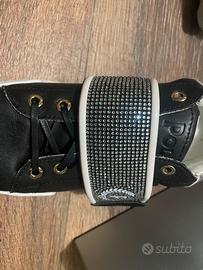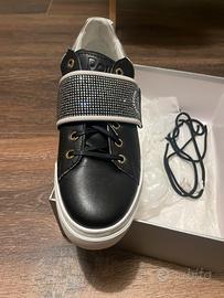 Sneakers in pelle nera. Perfette per ogni outfit. La suola in gomma bianca ,rialzata sul retro le rende molto comode . Banda con brillantini. Misura 38. Usate pochissimo,ottime condizioni,come nuove.