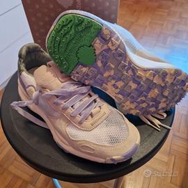 indossate 1 volta. i colori pastello, lilla e verde su fondo bianco. misura 41. doppio laccio bianco e velluto lilla. pelle e cotone di cui una parte retata.