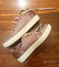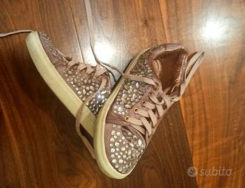 Scarpe con decorazioni in cristalli sul lato esterno. In raso rosa. Nella parte retrostante, quella dove poggiano i talloni sono presenti piccole usure (vedi foto) ma esistono varie soluzioni per ripararle in modo molto economico
