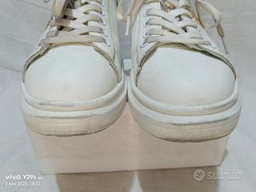 Scarpe Shop Art da donna a tinta unita in colorazione bianco con dettagli e loghi in contrasto di colore oro e glitter. Modello con chiusura con lacci in tessuto logati, punta rotonda e suola alta in gomma. Materiale in ecopelle. Taglia 36 ottime le condizioni generali. Le sneakers Shop-art sono perfette per gli amanti della moda e del comfort. Grazie allo stile unico e alla qualità della gomma, saranno un tocco di classe per ogni tuo outfit. Non perdere l'opportunità di essere alla moda con gli Shop-art!