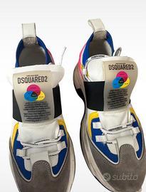 Sneakers originali DSQUARED modello sport Color Theory con dettagli in blu giallo rosa e grigio linguetta con stampa grafica a tema sportivo e lacci col logo DSQUARED scarpe in buono stato indossate, ma ben conservate.