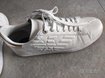 vendo bellissime sneakers emporio Armani praticamente nuove utilizzate una sola volta numero 41 e 1/3 . prezzo da nuove 145 per errore taglia. non potevo aggiungere altre foto ma sei interessati vi mando le foto delle suolette dove si vede che sono nuove e della scatola col prezzo