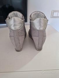 Vendo scarpe donna marca Geox, modello D Illusion A, taglia 39, in pelle, con zeppa interna, altezza 7 cm, suola in gomma evergreen traspirante, colore grigio chiaro, usate pochissimo.
