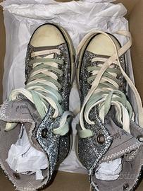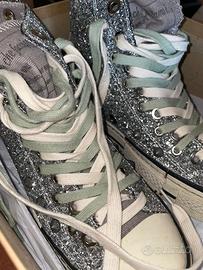 Vendo sneakers alte con glitter argento, davvero particolari e perfette per chi vuole distinguersi. Modello simile a Converse, con suola in gomma e dettagli effetto vintage. Mai indossate, solo provate in casa. Complete di scatola.